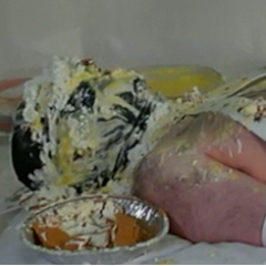 Messymissmia was surprised by MrMuck with a big sloppy cream pie to the face